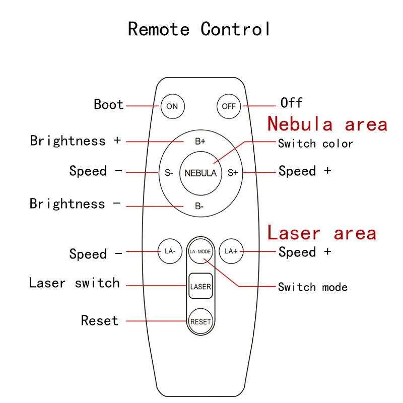 [Manual Switch, Remote Controller] You can use the remote control to adjust the pattern, brightness and rotation speed to customize the projection effect you like. Star or nebula patterns can be used simultaneously or separately. Besides, there are 3 buttons at the back for turn on/off the light and adjust the nebula and stars.